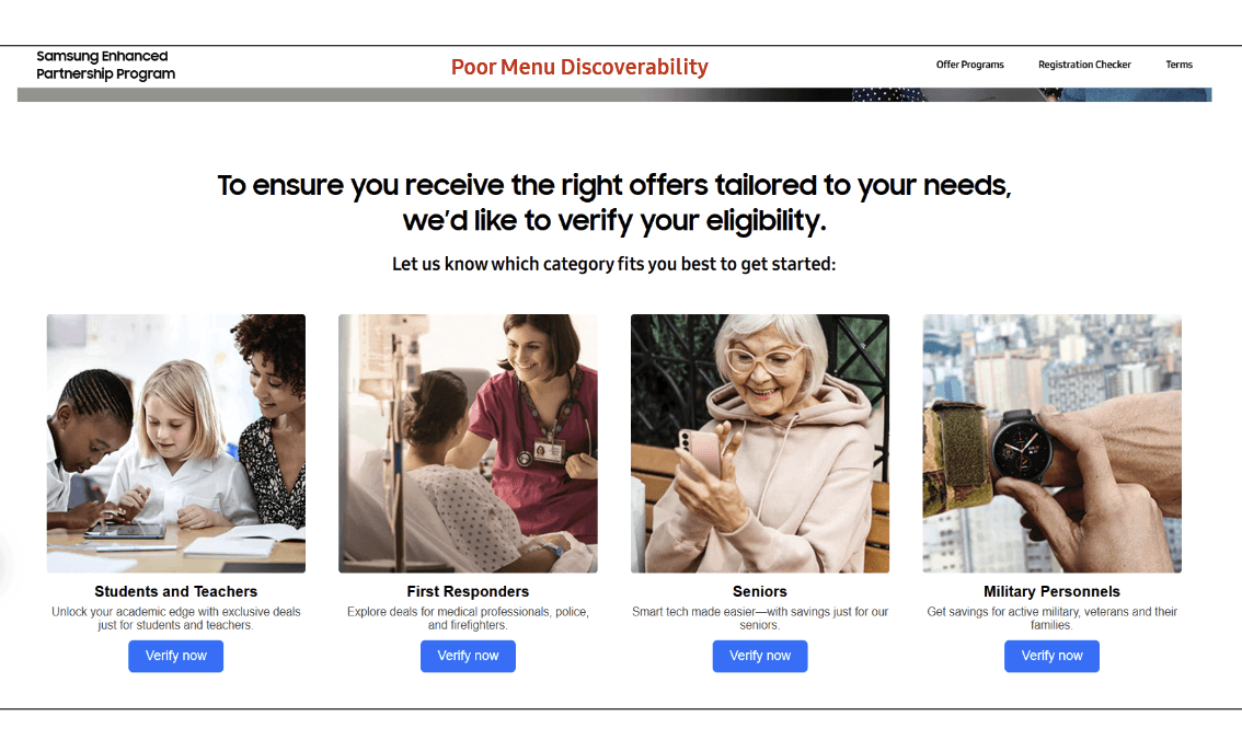 Users could not find student discounts because they were labeled as "Partnership Programs." This internal corporate jargon did not match the user's vocabulary.